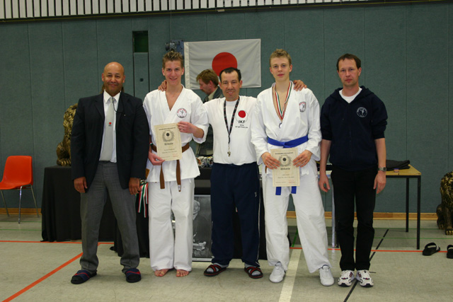 Dieses Bild wurde am 23.04.2005 auf der Landesmeisterschaft der Regionen in Remscheid/NRW aufgenommen. Es zeigt von links IKF-Präsident Mohamed Oussar (6. Dan), Christian Pfannkuchen, Mohamed el Jazidi (3. Dan), Lukas Lebisch und Bert Gardon (1. Dan). |