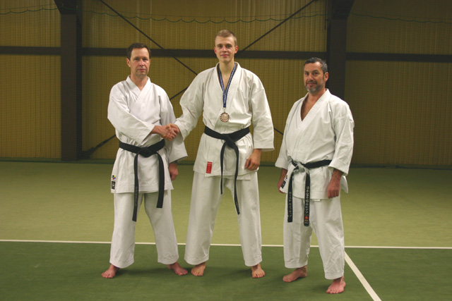 10.10.08: Herzlichen Glückwunsch: Lukas Lebisch erkämpfte sich bei der Karate-WM der SKDUN in Frankreich den 3. Platz im Kumite. Hier ist er mit seinen beiden Trainern Bert Gardon (li.) und Horst Wittig zu sehen. |