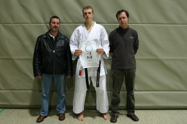 Efthimios Karamitsos (6. Dan) erfolgreich seine Prüfung zum 1. Dan ab. Zu sehen ist er hier mit seinen beiden Trainern: links Horst Wittig (4. Dan) und rechts Bert Gardon (2. Dan). |