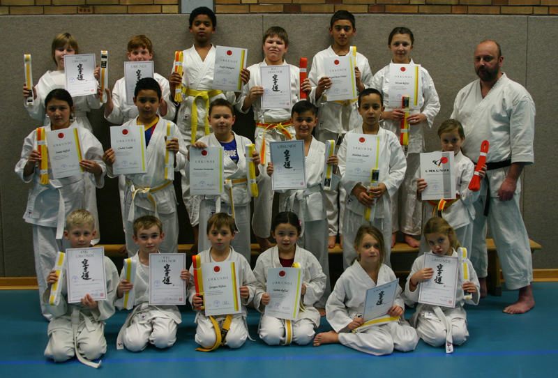 18.12.2013: Kinderprüflinge Hinten v.l.: Joel Stadtmüller, Fabian Mochi, Assefa Mulugeta, Sebastian Heiling, Miguel Reyes-Nunez und daneben Prüfer Dieter Velten. Mitte v.l.: Amina Reffad, Chahid Zouhri, Dominykas Meskauskas, Emin Aksakal, Abdelilah Zouhri und Maria Tsiftsi. Vorne v.l.: Keanu Trupp, Niklas Umbach, Georgios Tsiftsis, Yasmin Reffad, Loreen Storch und Michelle Krupa. |