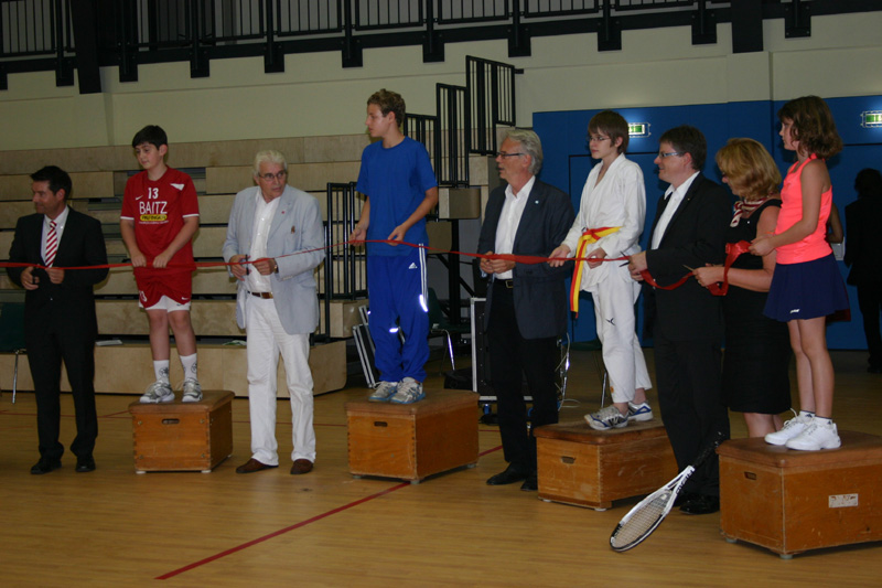26.08.2011: Eröffnungsfeier des neuen TSG-Sportzentrums in Bürgel v.l. Dr. Rainer Lehmann, Handballkind, Sportkreisvorsitzender Peter Dinkel, Leichtathletikkind, Oberbürgermeister Horst Schneider, Karatekind Erwann Robert, n. bek., Dagmar Ströhlein, Tenniskind |